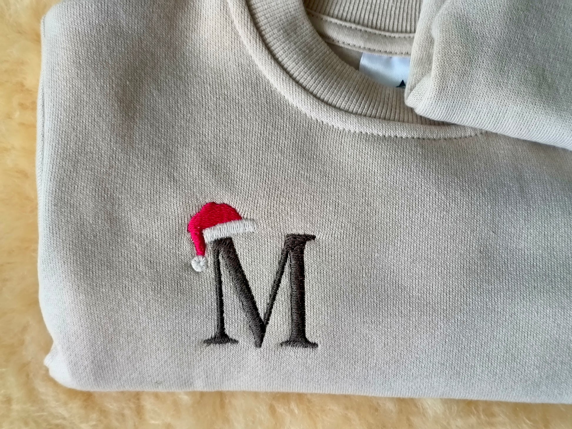 The Christmas Monogramed Jersey is made of soft oatmeal colored cotton brushed fleece with cotton/polyester ribbed cuffs and waistband. Select your little ones initial and we will carefully stitch it onto your chosen jersey topped with a festive Santa hat!